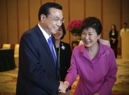 韓國(guó)總統(tǒng)樸槿惠對(duì)李克強(qiáng)總理表示:"韓中日三國(guó)合作有利于地區(qū)和平穩(wěn)定。要引導(dǎo)日本抱著正確的歷史觀,為東北亞和平做出貢獻(xiàn)。"