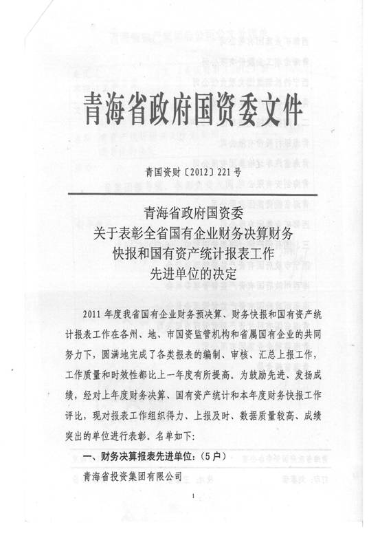 2012年,在集團及所屬各公司領導的高度重視下,在所屬各公司的大力支持和密切配合下,在辛勤工作在財務會計崗位上的同事們的共同努力下,集團總公司圓滿完成了省國資委和省財政廳各類報表的上報工作,財務信息工作質量、時效性和財務分析水平都比上一年度有所提高,受到了省國資委和省財政廳的好評,集團總公司2011年度財務決算工作被省國資委評為先進單位,集團財務審計部張莉青同志被省財政廳評為2012年度財務快報工作先進個人。