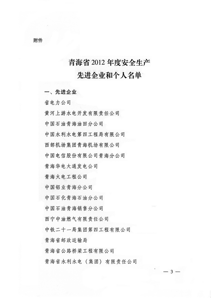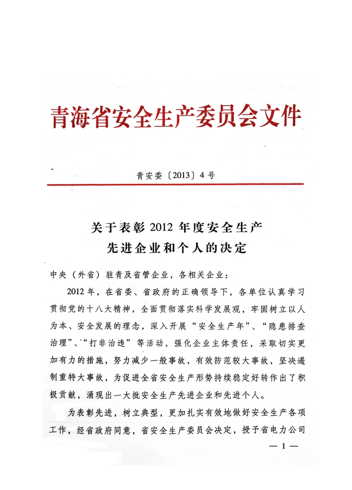 2012年,在省委、省政府的正確領(lǐng)導(dǎo)下,青海省物產(chǎn)集團總公司認(rèn)真學(xué)習(xí)貫徹黨的十八大精神,全面貫徹落實科學(xué)發(fā)展觀,牢固樹立以人為本、安全發(fā)展的理念,深入開展"安全生產(chǎn)年"、"隱患排查治理"、"打非治違"等活動,為促進全省安全生產(chǎn)形勢持續(xù)穩(wěn)定好轉(zhuǎn)做出了積極貢獻。為此,經(jīng)省政府同意,省安全生產(chǎn)委員會決定授予青海省物產(chǎn)集團總公司"2012年度安全生產(chǎn)先進企業(yè)"榮譽稱號。